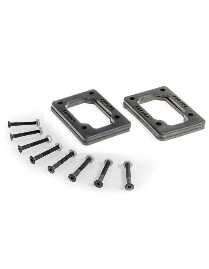 Soft, lightweight hollow risers help dampen your ride and lift the truck to prevent wheelbite with larger wheels. Standard baseplate mounting hole configuration universal to all new-school skateboard trucks.